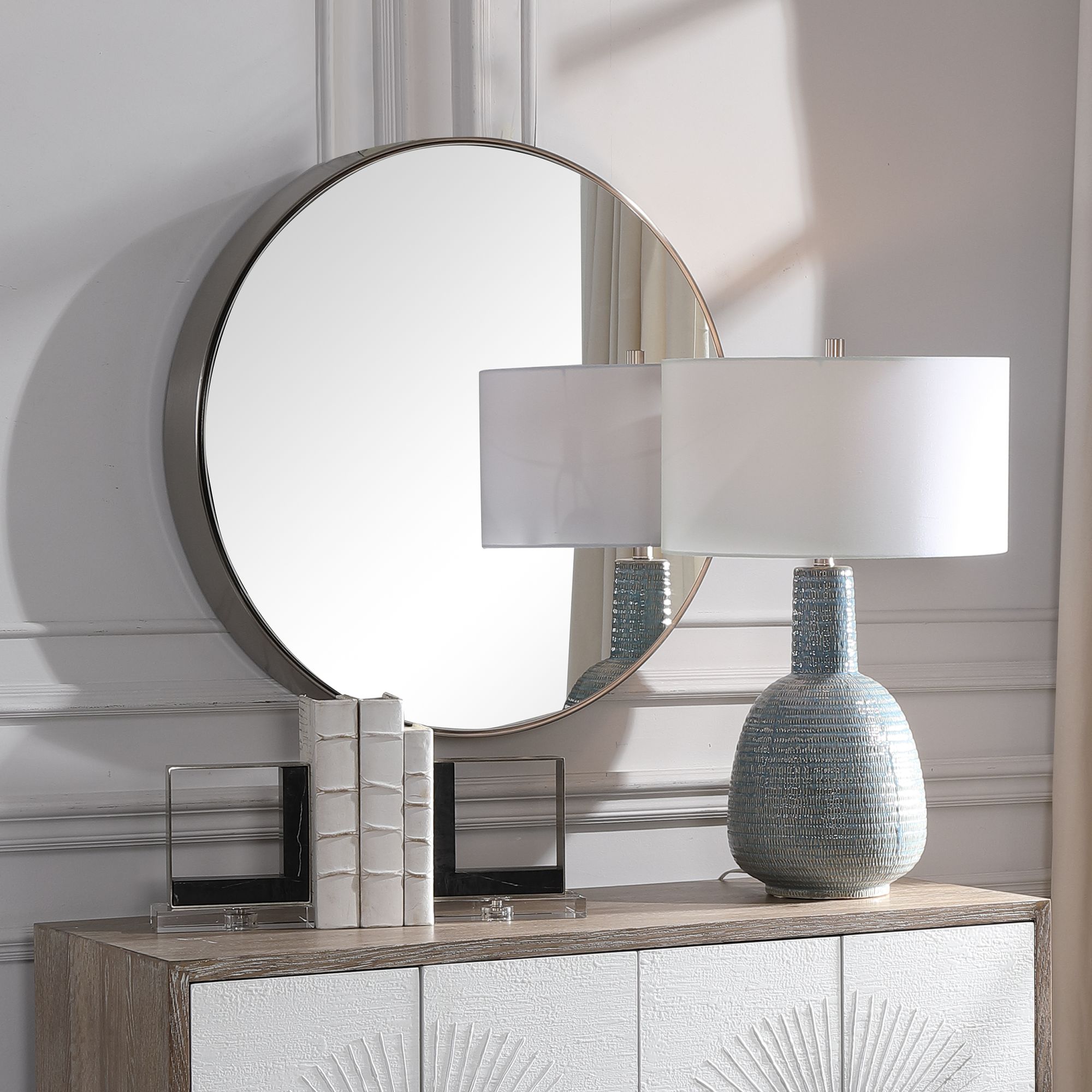 Shipment was aggressively handled by canada post and despite being very well packed and marked fragile, the mirror arrived broken. The following are detailed specifications about the uttermost tazlina brushed nickel round mirror. Attractive hammered texture adds depth to the finish. The mirror sticks to many surfaces, including glass, mirror, tile, fiberglass, wood and painted surfaces. Solid heavy 100% copper construction.